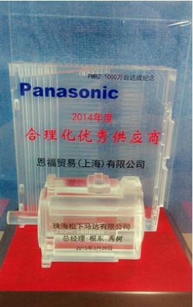 2015年3月20日,恩福貿(mào)易(上海)有限公司獲得了珠海松下馬達有限公司頒發(fā)的2014年度“合理化優(yōu)秀供應商”獎。頒獎儀式在松下的會議室舉行,恩福的市場區(qū)域經(jīng)理洪道弘,銷售部副科長嚴志楹以及銷售擔當梁博出席了頒獎儀式并代表恩福領取了獎項。